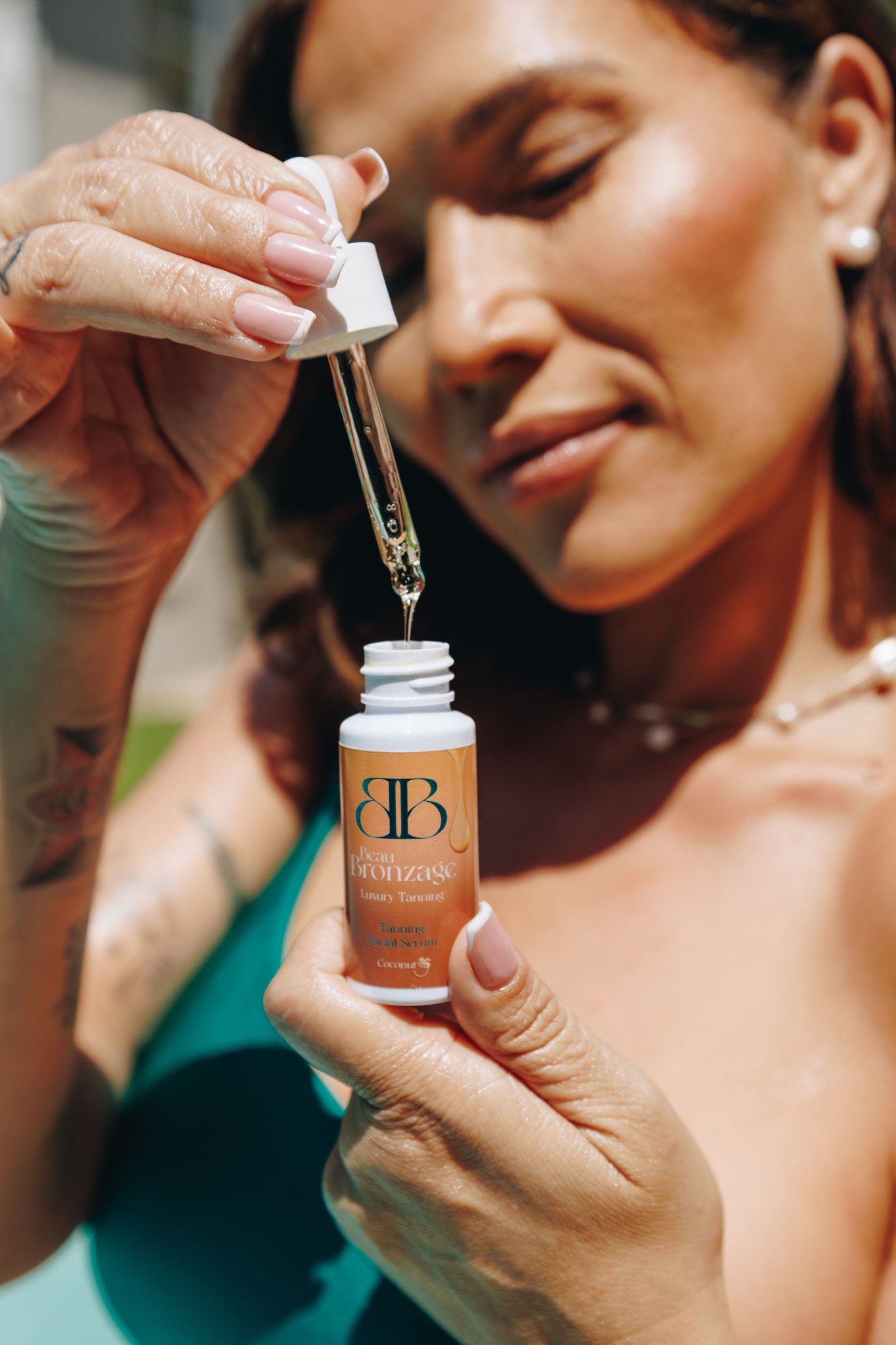 A woman appliesBeau Bronzage Face Drops with Hyaluronic Acid to her hand using the bottle's pipette